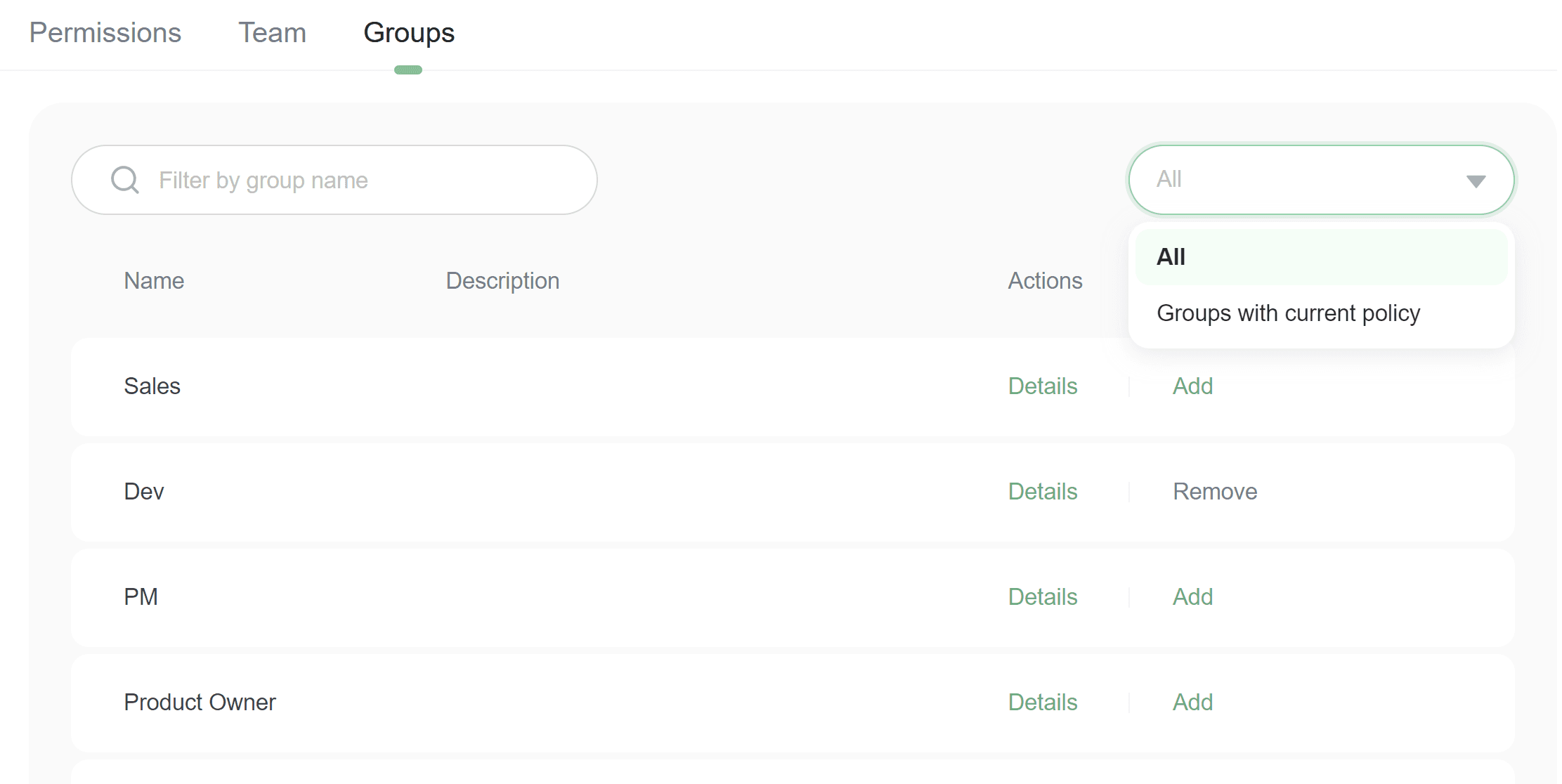 3. Find the groups that you assign the policy to. Click Add button on the group item in the list.